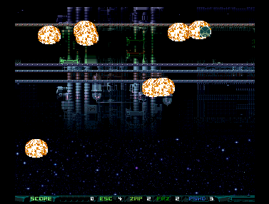 One of the standout features of Apano Sin is its weapon loadout system. Your ship can carry two weapons at once, chosen from four unique options—Green Flash, Blue Blizzard, Bomber, and Power Cannon. Each weapon has its own firing pattern, rate of fire, and strategic applications, so part of the fun lies in experimenting with different combinations to find the loadout that best suits your play style and the foes on each moon.