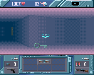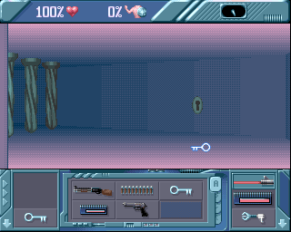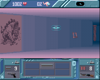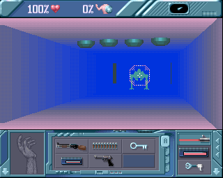While the level geometry itself remains relatively simple—straight corridors, right angles, and repetitive wall panels—the use of color tinting helps distinguish one area from the next. A corridor bathed in cool blue light feels cold and foreboding, while a red-tinged maintenance bay hints at danger lurking ahead. This clever use of lighting demonstrates how limited resources can still produce a compelling atmosphere.