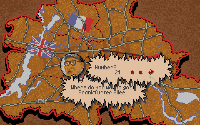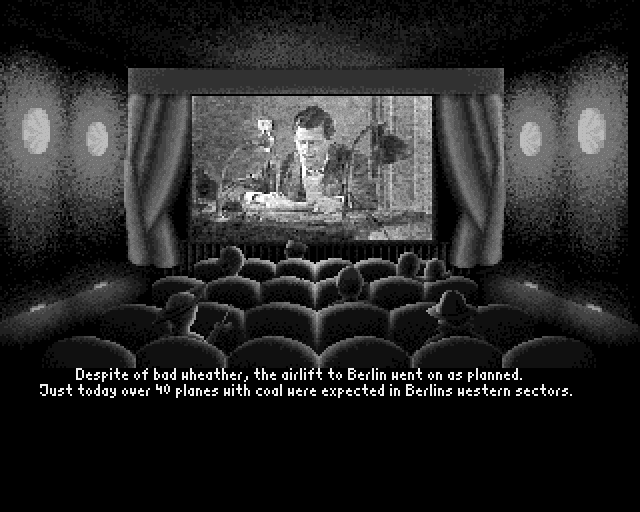 Berlin 1948 employs detailed pixel art backgrounds that evoke the grim atmosphere of postwar Germany. Crumbling façades, burnt-out vehicles, and flickering streetlamps paint a bleak yet compelling portrait of a city in limbo. The color palette is dominated by muted grays and sepia tones, punctuated by the glow of searchlights and the occasional splashes of red from Communist banners.