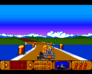 Visually, Bump ’N’ Burn embraces a bright, cartoon-inspired aesthetic reminiscent of classics like OutRun and high-energy arcade racers of the ’90s. Each track boasts a unique theme—from sun-baked desert highways to industrial underground tunnels—complete with animated hazards that range from rolling barrels to electrified rails. Texture detail may not rival modern high-definition titles, but the stylized visuals lend the game a timeless, playful charm.