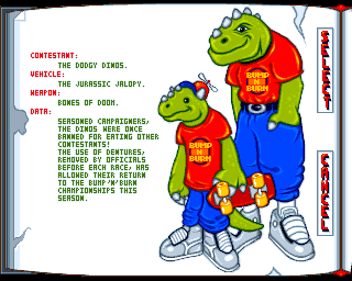 Unlike narrative-heavy racing games, Bump ’N’ Burn focuses on character-driven rivalries rather than elaborate cutscenes or dramatic plot twists. Each of the computer-controlled racers carries a bit of backstory—whether it’s Loretta L’Amour’s quest for a sponsorship deal or the Buck-Toothed Beavers’ mischievous team antics—and these tidbits are conveyed through brief pre-race banter and post-race taunts. The result is a lighthearted, arcade-style storyline that feels appropriate for the fast-paced action.