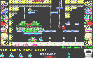 Chubby Gristle delivers a delightfully old-school platforming experience reminiscent of classic Monty Mole adventures. You take on the role of Chubby, a portly car park attendant whose mission is singular: devour as much food as possible before someone drags him off to a health farm or gym. Across a series of flick-screen levels, you’ll leap from platform to platform, climb ropes, and time your jumps perfectly on moving ledges to snatch burgers, chocolate bars, and other tempting treats. The simple yet satisfying controls make it easy to pick up and play, but mastering the precise timing needed to avoid hazards offers a rewarding challenge.