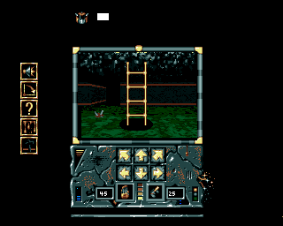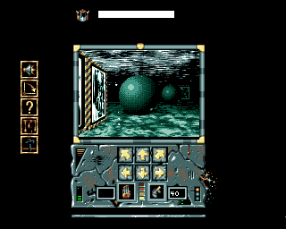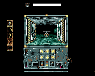 For a freeware Amiga title, Dawn: A New Beginning delivers surprisingly crisp visuals that evoke the charm of early-90s RPGs. The interface is neatly organized with icon boxes lining the left edge of the screen, each sporting a distinctive symbol—speaker, arrow, question mark, and cross—that instantly communicates its function. This clean layout ensures that critical information is always within your peripheral vision.
