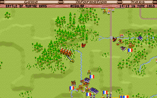 Unit sprites are small but distinct, with flag pennants and unit counters indicating troop types and morale states. Animations are minimal: musket volleys smoke briefly, cavalry troopers wheel, and infantry figures pivot to face their targets. These modest touches punctuate the action without overwhelming system resources of the era.