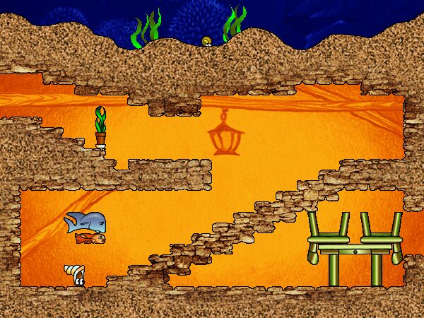 Though Fish Fillets debuted in the late 1990s, its hand-drawn 2D visuals retain a timeless charm. The backgrounds are painted with subtle gradients, evoking an immersive underwater environment filled with rocks, corals, and sunken debris. This atmospheric backdrop never overwhelms the foreground objects, ensuring that crates, steel blocks, and other interactive elements remain visually distinct and easy to track during fast-paced puzzle sequences.