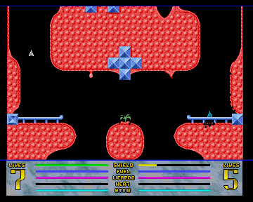 Gravity Power’s visuals reflect the best of the Amiga’s capabilities in the mid-’90s. The sprite work on the arrow ships is crisp and clearly animated, with subtle thruster glow effects that bring the craft to life. Backgrounds shift between stark monotones and richly textured caverns, lending each map its own character and atmosphere.