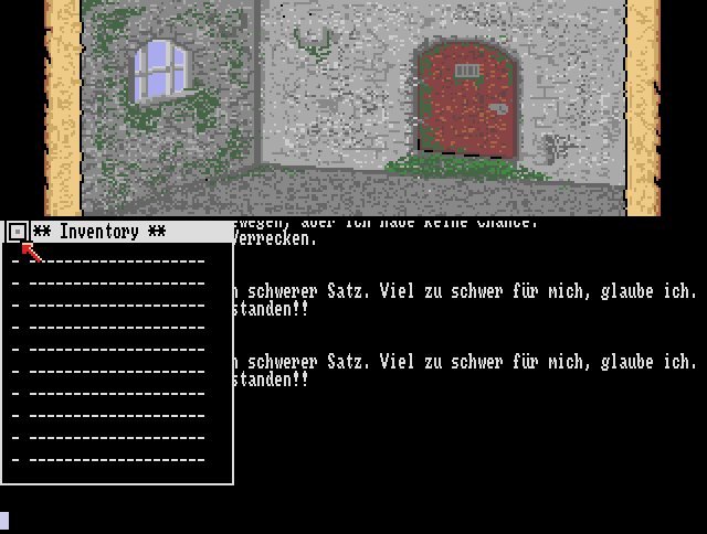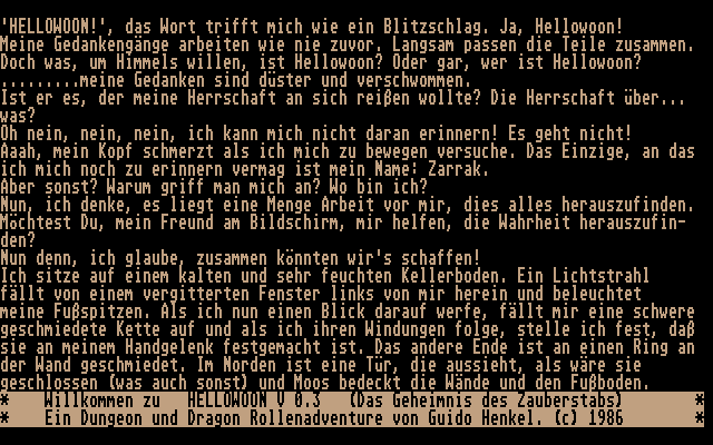 Hellowoon: Das Geheimnis des Zauberstabs offers a classic text-adventure experience enhanced by a simple parser system. Players type commands such as “unserve cell” or “use spell” to interact with the environment, solve puzzles, and progress through the story. Though the parser occasionally struggles with complex phrasing, it reliably interprets basic verbs and nouns, ensuring that newcomers to interactive fiction can jump in without a steep learning curve.