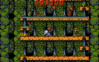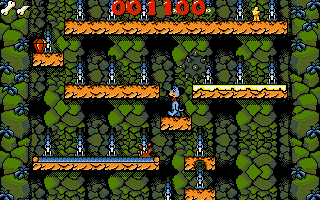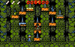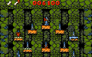 The game structure is divided into four distinct “Worlds”—Under World, Sea World, Canyon World, and Sky World—each unlocked by entering a specific code you earn as you progress. Within these Worlds, you’ll encounter hazards like lethal drops, patrolling flying balls, patches of slippery ice, and sticky tar pits. Teleporters whisk you across the screen in unexpected ways, and colorful inhabitants—such as ghostly fish or swooping canyon birds—add both challenge and charm. Huck’s bone energy meter depletes when you collide with an obstacle, and running out of energy ends your current take, forcing a restart or the use of a continue.