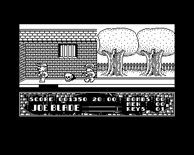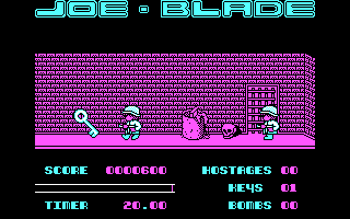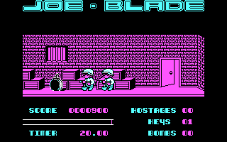 Joe Blade embraces the charm of early 8-bit visuals with crisp, colorful sprites set against stark, easily readable backgrounds. The side-on viewpoint gives you a clear view of oncoming enemies and environmental obstacles, while the limited color palette is used effectively to distinguish doors, keys and explosive devices. There’s a distinct retro aesthetic here that appeals to fans of classic platformers and action-adventure titles alike.