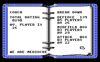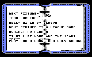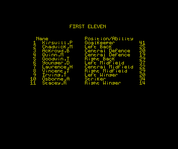 The game begins with every manager—fictional or you—starting in the fourth division, offering a true “rags-to-riches” feel. Navigating through the league tables and cup competitions relies on a suite of menus: check in with the chairman to gauge his patience, confer with the physio on injury reports, or task your scout to uncover transfer targets. Taken together, these systems present a surprisingly deep management sim for its time.