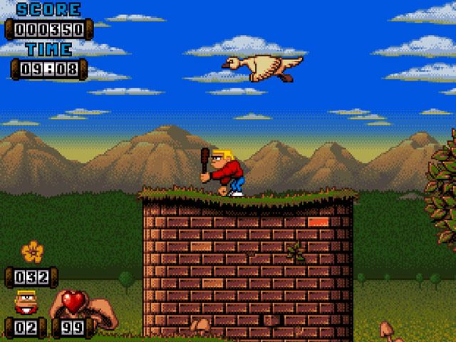 Visually, Kid Chaos leans into colorful, cartoon-inspired backdrops that stretch from lush, vine-choked gardens to neon-lit factory floors. Each world introduces unique environmental hazards—poisonous sludge in the Toxic Wasteland, bouncing conveyor belts in the Toy Factory, and pulsating energy grids inside the Techno Fortress—that are rendered with crisp, 16-bit style pixel art. The palette shifts dramatically between levels, ensuring the scenery always feels fresh.