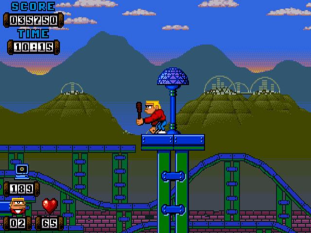 Character and enemy sprites boast smooth animations, with Kid’s running, jumping, and club-swipe frames captured in satisfying detail. Wildlife comes in all shapes and sizes—from spiky armored critters to robotic foes—and destruction targets explode with cartoonish flair, sending debris flying across the screen. Parallax layers in the backgrounds add a sense of depth, especially in the Ruined City, where crumbling skyscrapers drift eerily behind the action.