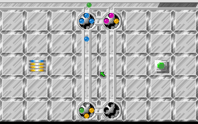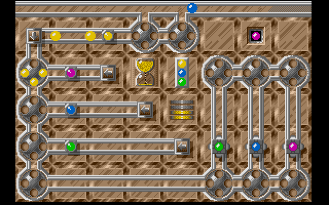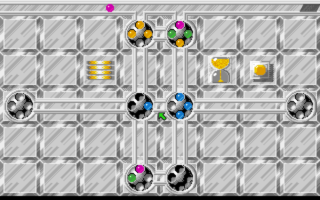 Log!cal’s core mechanic is deceptively simple: you must arrange clusters of four colored balls—green, purple, blue, or yellow—into quartets by manipulating a network of spinning orbs and connection paths. Each orb you encounter can be rotated at will, revealing new angles and linkages, and from there you pick a ball to send racing down the beam-like conduit that attaches it to the next hub. Successfully aligning four balls of the same hue clears them from the board, rewarding you with points and opening up fresh routes for more intricate combinations.