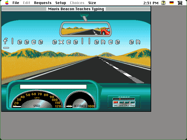 Beyond static drills, the game spices up practice with an arcade-style typing race. As colored text scrolls across the top of the screen, you compete against computer-controlled drivers whose skill levels scale with each new stage. Fast, accurate typing translates directly into speed on the racetrack, adding a layer of adrenaline to otherwise routine exercises.