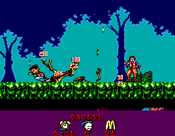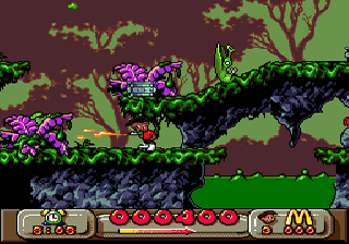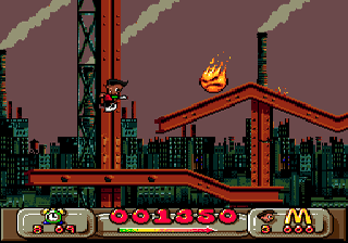 The visual style of Global Gladiators is cheerful and cartoonish, with bright color palettes that pop against the darker tones of polluted environments. The McDonald’s branding is woven seamlessly into the backgrounds: you’ll spot golden arches peeking through toxic clouds, soda fountains turned into slime geysers and familiar burger imagery repurposed as platform blocks. This playful approach to branding makes the game feel like a love letter to 1990s platformers.