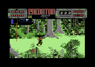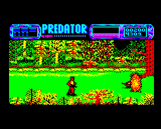 Sprite work is serviceable, with fleshed-out character designs that nod to Arnold Schwarzenegger’s likeness and the Predator’s iconic helmet. Enemy soldier sprites sport differing uniforms to indicate increasing difficulty, and the scorpions scuttle across the screen with enough animation frames to feel alive. The Predator boss sprite is particularly imposing—complete with its shoulder-mounted plasma cannon and distinctive mask—though its cloaking effect is represented by simple flicker rather than a smooth transparency, a limitation of the hardware.