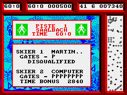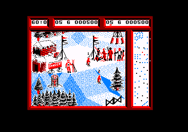 The control scheme is accessible yet demands precision. A simple left or right movement on the joystick tilts your skier in the chosen direction, while a single fire button thrusts you forward, mimicking the action of pumping ski poles for extra speed. This minimal setup keeps the focus squarely on your reflexes and decision-making, as you judge when to push hard or pull back to better navigate perilous corners.