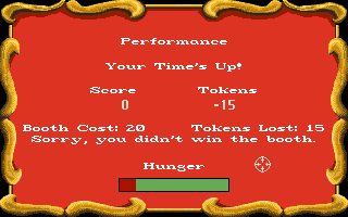 Visually, SideShow capitalizes on the Amiga’s graphical prowess, rendering vibrant carnival tents, colorful targets, and animated characters that pop off the screen. Each mini-game sports its own palette—bright reds and yellows for the balloon pop, eerie purples and greens for the Haunted Hill—giving a distinct personality to each attraction. The animations for each character, particularly the clown’s exaggerated expressions, inject a playful charm.