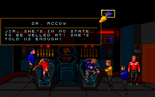Dialogue is presented through text boxes, with occasional cutaway illustrations of crew members speaking. While there’s no full voice acting, key lines from Kirk, Spock, and others are occasionally hinted at with beeps and intercom tones that evoke the show’s audio style. Story beats—such as scanning for lifeforms, negotiating with aliens, or foiling sabotage—feel true to Roddenberry’s vision of peaceful problem-solving backed by a capable starship crew.