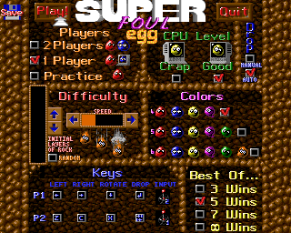 The options menu is impressively robust for an AMOS‐written title. You can adjust the number of blob colors—simplify the game with fewer hues or crank up the challenge by using all available colors. Speed settings let you tailor the pace to your skill level, and you can even choose whether the game starts with prefilled lines at the bottom. Victories are determined by a best‐of series, with you deciding how many wins are required for triumph, making each match feel customizable and fair.