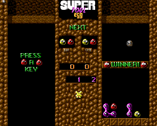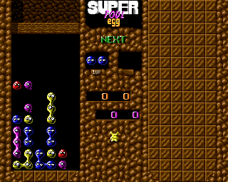 Visually, Super Foul Egg may not push the limits of the Amiga hardware, but it nails the essential charm of the Puyo Puyo universe. The playfield is set inside a slightly muddy, stone‐like frame that gives the game a distinct, grounded feel. Each blob character is rendered with simple but expressive eyes and smooth animations that bring the screen to life whenever a combo is unleashed.