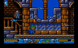 Each of the five worlds—Medieval, Wild West, Science-Fiction, Gangster, and Horror—brings its own unique set of foes and hazards. One moment you’re dodging fireballs and jousting gargoyles in the Medieval realm, the next you’re tiptoeing past cactus patches and dueling outlaw cowboys under the scorching sun of the frontier. The pacing is brisk, with just enough downtime between skirmishes for you to catch your breath (and snag extra shields or missile upgrades).