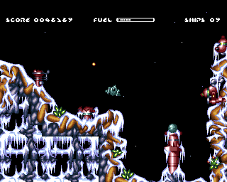 Zarathrusta marks a departure from the vector visuals of its inspiration, Thrust, by opting for richly colored bitmaps. Cavern walls are adorned with subtle rock textures, and each environment—icy caverns, molten caverns, and crystalline vaults—boasts a distinct palette. Though the resolution feels retro, the art direction uses lighting effects and nuanced shading to create depth. Explosions and laser blasts pop against darker backgrounds, making combat both readable and visually stimulating.
