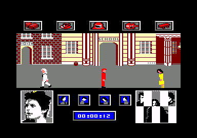 On platforms like the Commodore 64 and ZX Spectrum, Electric Dreams’ Back to the Future features crisp, colorful sprites that capture the look of Michael J. Fox’s Marty McFly, the bespectacled George McFly, and the menacing Biff Tannen. Each single-screen area is distinctively designed—whether it’s Lorraine’s living room or the school courtyard—and uses a limited but effective palette to differentiate characters and interactive objects.