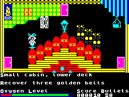 Devil’s Crown challenges players to navigate the sunken wreckage of a cursed sailing vessel across 40 interconnected screens, each brimming with both environmental hazards and hostile creatures. As you explore the depths, your primary objective is to locate and collect seven hidden gems, which in turn must be placed into an ancient golden crown. However, before each gem can appear, you must activate a series of enigmatic flashing objects scattered throughout the ship, transforming them from ghostly apparitions into tangible items that unlock the next stage of your quest.