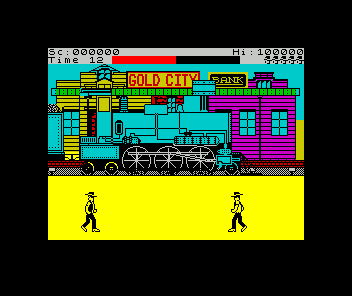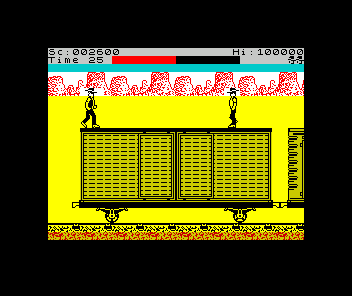 Express Raider delivers a fast-paced, stage-based beat ’em up experience set against a dusty Wild West backdrop. You begin your outlaw career by taking on the local banker in a street brawl, employing a mix of kicks, punches, and grabs to clear your path. From there, the game smoothly transitions to a horseback chase across open plains, where agile coyotes test your reflexes. While these quick canine encounters are easier to dodge than to down, they serve as a lively warm-up before the main event.