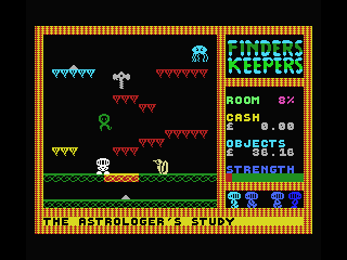 Finders Keepers delivers a classic platforming adventure that balances action with strategic item management. As Magic Knight, you’ll traverse the sprawling castle of Spriteland, leaping across platforms, dodging hazardous traps, and fending off energy-draining foes. Each contact with an enemy saps your vitality, demanding both caution and skillful movement to preserve your precious life bar.