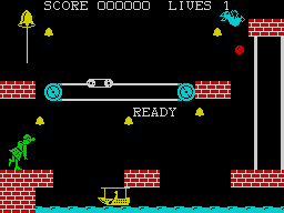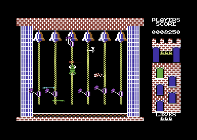 The archetype of the Hunchback of Notre Dame really isn’t terribly nuanced: he jumps around towers, ringing bells, rescuing Esmeralda and being generally physically unattractive. Here he does all of these things, in a more platform-oriented take than the original, clambering up dangling ropes as they rise and fall, avoiding environmental threats such as rabid bats, thrown hatchets and enormous grinding clockwork gears all in the pursuit of small bells strewn across each screen’s platforms. Gathering all the bells permits you to advance higher up the tower, at the top of which the damsel in distress awaits your homely visage.