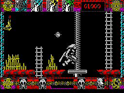 Enemy sprites are distinct and varied, ranging from skeletal guardians and spectral hounds to the twisted reflections of Lone Wolf himself. Animation frames are modest but well-executed, with satisfying feedback when your blade strikes home or an enemy collapses in a burst of pixels. The flick-screen transitions are smooth, ensuring you never lose track of your position while navigating the labyrinthine layout.