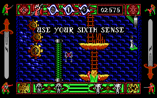 Once inside the inverted pyramid of Kazan-Gor, you guide Lone Wolf through flick-screen chambers filled with monsters, pitfalls, and the ever-looming threat of Dhazag-Oud’s mirror shards. Combat is real-time but deliberately paced: you move with the arrow keys, strike with a dedicated attack button, and invoke your chosen Kai powers when the situation demands. The result is a satisfying interplay between strategic skill management and twitch-based swordplay.