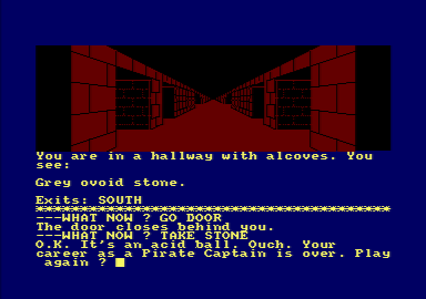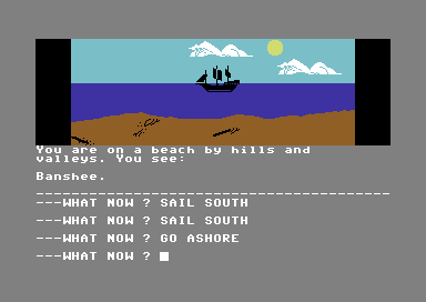 Seas of Blood places you at the helm of the dread vessel the Banshee, tasking you with steering through Khul’s Inland Sea in search of treasure and plunder. The core interaction is a two-word text adventure interface bolstered by rudimentary graphics, offering commands such as “SAIL NORTH” or “ATTACK SHIP.” Though this streamlined parser limits the breadth of possible inputs compared to fully text-based adventures, it keeps the pace brisk as you navigate from wretched Tak to the isle of Nippur. Players accustomed to modern point-and-click systems may find the succinct input style nostalgic yet challenging.