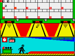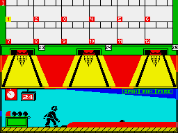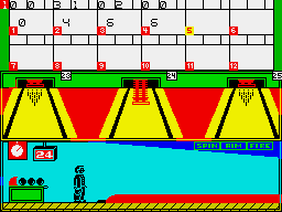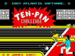 Tenpin Challenge adopts a minimalist graphical style, reflecting the limitations of early home computing hardware. On-screen elements are clean and functional: a top-down lane view transitions to a side-split that shows both the lateral movement of the ball and its forward trajectory toward the pins. While the sprites are simple, they’re well-animated, and the split-screen technique effectively conveys the physics of the shot without overwhelming the player with unnecessary detail.