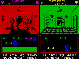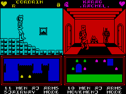 Given this was Consult Computer Systems’ first major collaboration with Mike Singleton, you might expect some rough edges, but Throne of Fire delivers surprisingly crisp visuals for its era. The split-screen layout remains clear, with each player’s viewport framed by sharp, colourful borders that match their prince’s heraldry. The scrolling castle display at the bottom is functional yet evocative, offering just enough detail to let you plot your next move without cluttering the action.