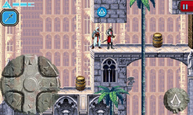 Given the hardware constraints of early mobile devices, Assassin’s Creed achieves remarkable clarity in its 2D presentation. Character sprites possess smooth animations, from the subtle flourish of Altaïr’s cloak to the fluid arcs of his sword strikes. Backgrounds—whether the dusty winding streets of 12th-century cities or the shadowy interiors of enemy strongholds—carry a muted palette that underscores the historical setting without overtaxing the processor.