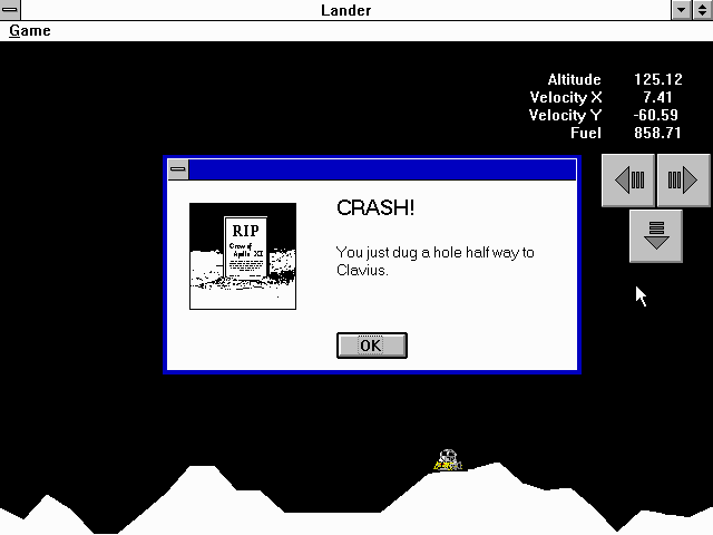 The user interface remains unobtrusive, with fuel gauges and velocity readouts displayed along the edges of the screen. Text and icons are sharp and legible, ensuring vital information is always in clear view. Although there’s no flashy animation or colorful palette, the game’s visuals are perfectly matched to its purpose: to immerse players in the unforgiving challenge of piloting a delicate craft across a barren, gravity-warped landscape.