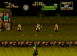 Throughout each stage, you’ll encounter enemy soldiers, tanks, helicopters, jeeps, and various defensive emplacements. Scattered weapon pickups—ranging from heavier machine guns to limited-use flamethrowers—encourage strategic play and resource management. Ammo is finite, so timing your bursts and knowing when to swap back to your default gun can be the difference between life and a quick reload screen.
