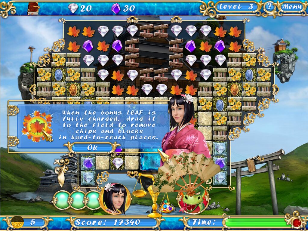 Each level presents a target count of jewels to remove, clearly displayed in a bar at the top of the screen. This simple goal structure keeps the focus squarely on speed and strategy: Do you go for large, hard-to-form groups that yield high scores, or chip away at smaller clusters to gradually fill your power-up meters? Speaking of power-ups, the three slots at the bottom of the screen reward you for matching their corresponding tiles. The clover removes a single unwanted tile, the leaf clears an entire group, and the flower transforms adjacent tiles into a matching set, opening up new combo opportunities.