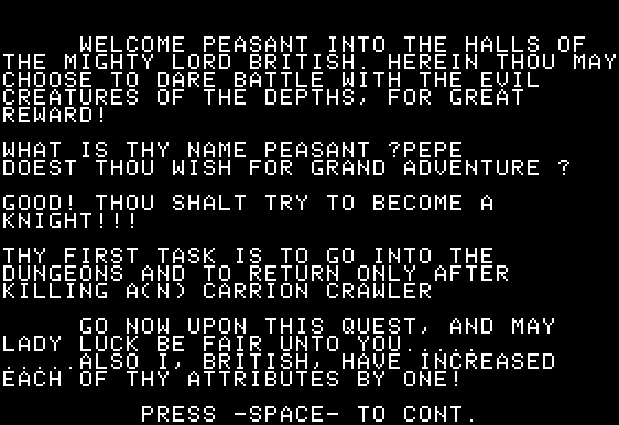 The narrative of Akalabeth: World of Doom is refreshingly straightforward. Long ago, the evil sorcerer Mondain unleashed hordes of monsters across the peaceful land of Akalabeth. Although the heroic Lord British drove Mondain away, the monsters remained, prowling in underground lairs and threatening innocent villagers.