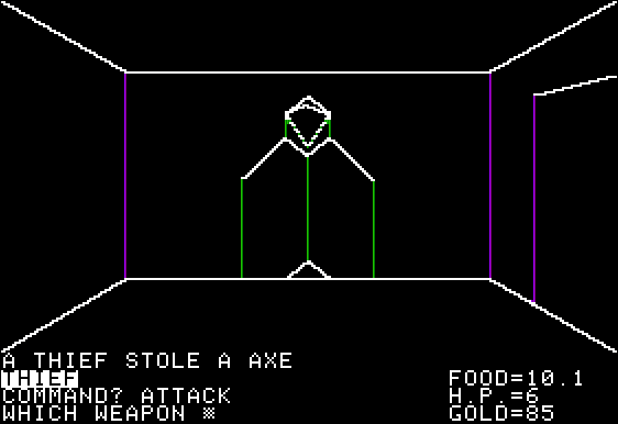 Once you venture into a dungeon, the perspective shifts to a first-person wireframe view, where every corridor branch might conceal treasure or a deadly monster. Combat is straightforward: you choose to swing a sword or cast a spell, then watch as your ASCII-rendered foe either crumbles or delivers a crushing blow. While there’s no real-time action, the turn-based feel keeps you pausing to plan each attack and monitor your health.