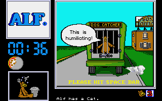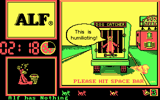 While the animation frames are few, the little flourishes—such as Alf’s hopping motion, the dog-catcher’s raised net, and the cat silhouettes in windows—add pleasant touches of personality. There’s an unpolished charm in the way objects pop into view when you pick them up, and how the screen flashes briefly whenever you’re spotted by an enemy. It’s hardly cutting-edge, but it’s perfectly serviceable for a budget release and holds nostalgic appeal for fans of early ’90s PC gaming.