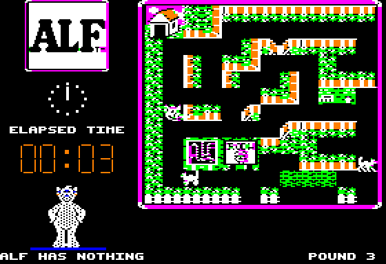 ALF: The First Adventure delivers a straightforward, arcade-style gameplay loop rooted in item collection and avoidance. You take on the role of everyone’s favorite extraterrestrial, traversing a modest neighborhood map in search of crucial spaceship parts, a key to start your engine, and—of course—a few helpless cats for fuel. The design is clearly budget-minded, which means levels are compact and objectives are simple, but there’s enough variety in item placement and enemy patrol patterns to keep each round feeling fresh.