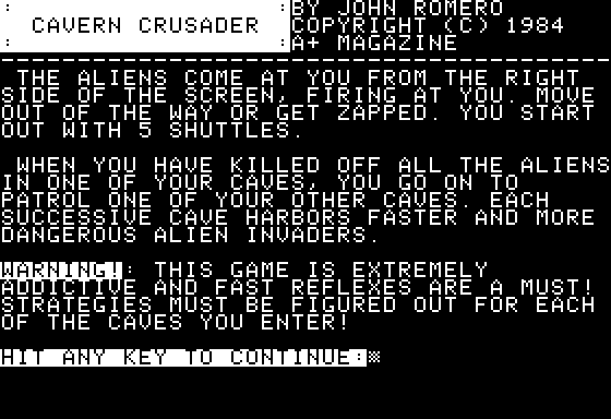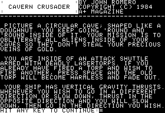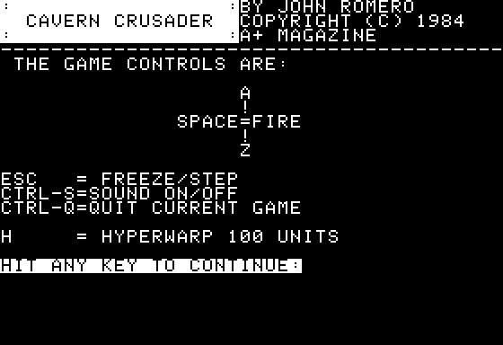 Cavern Crusader delivers a fast-paced, side-scrolling shooter experience that will feel immediately familiar to fans of early arcade classics. You pilot a lone spaceship through a series of underground caverns, blasting waves of alien creatures as you navigate narrow passages and deadly traps. The control scheme remains faithful to the Apple II roots, relying on the A and Z keys to modulate thrust and the arrow keys to steer, while the spacebar handles your laser cannon.