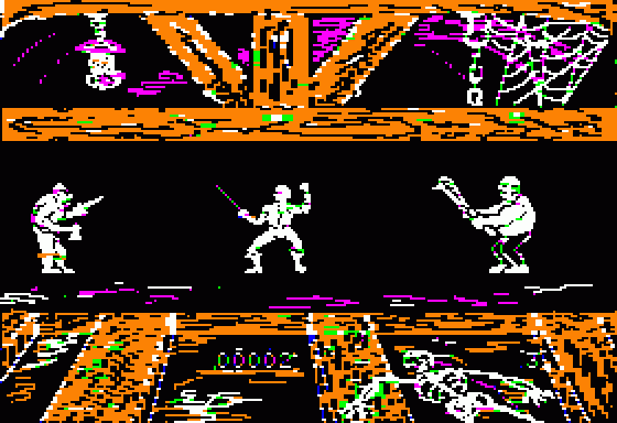 Visually, Swashbuckler embraces the limitations of early home computers with modest yet charming sprite work. Characters are rendered in simple block colors, but the animations—albeit brief—convey enough motion to give each enemy type a unique personality. The snakes coil and uncoil menacingly, while rats scamper with frantic urgency around your feet.