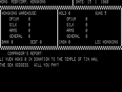 Although Taipan is primarily a trading simulation, it is loosely framed around James Clavell’s eponymous novel. You step into the shoes of an ambitious merchant in 1800s Hong Kong, forging your path in a world of cutthroat competition, shady alliances, and shifting loyalties. The narrative is emergent: each purchase, extortion demand, and narrow escape from capture weaves into your personal merchant saga.