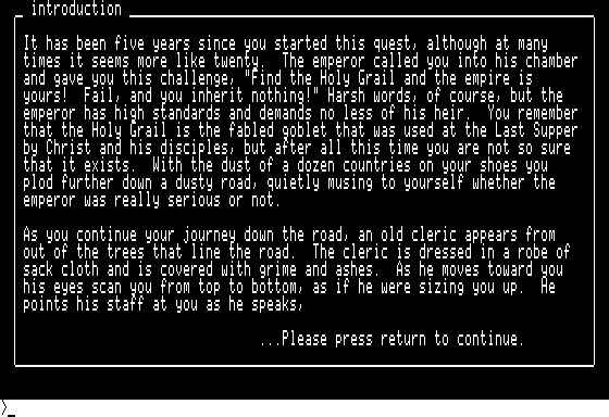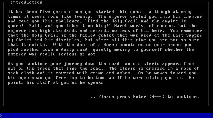 Overall, the gameplay marries the cerebral pleasure of traditional text adventures with the occasional high-stakes action scene. If you enjoy cryptic riddles, detailed world descriptions, and the tactile thrill of text-based combat, The Holy Grail delivers a robust experience that rewards patience and creativity.