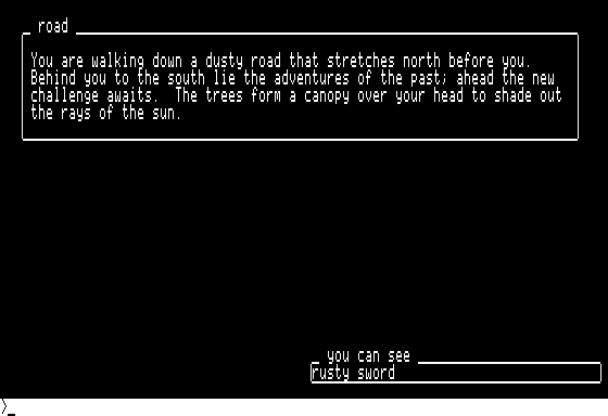 The interface itself is clean and intuitive: a scrollable text window presents narrative and responses, while a prompt line awaits your commands. Menus for saved games, settings, and help screens are neatly organized in ASCII-style boxes that evoke the charm of early-era home computer adventures. Font choices and color schemes remain readable, even during extended play sessions.